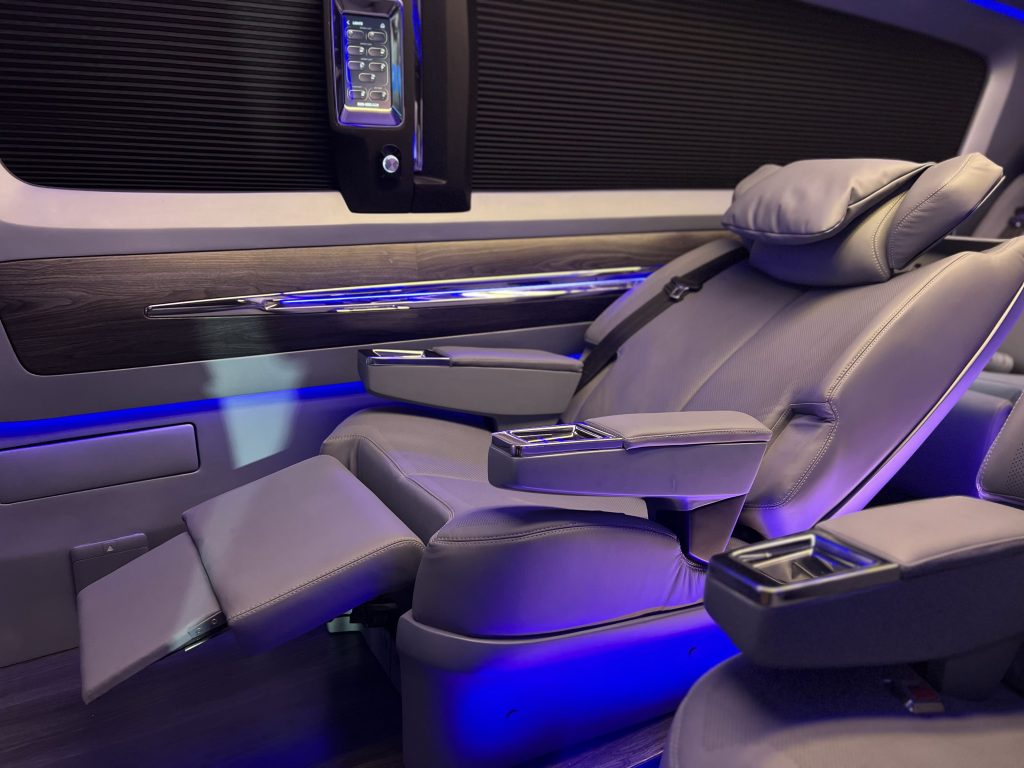 Step into a world of luxury with six forward-facing recliners, complemented by a fully-equipped washroom and pantry, all enveloped in an ambiance of opulence. From wireless phone charging stations to individual screens and tables, every detail has been meticulously curated to ensure unparalleled comfort and convenience, setting a new standard for luxury travel.